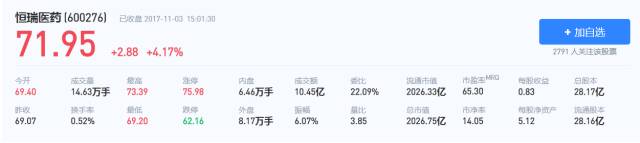 10月份以來,恒瑞醫藥累計漲幅接近兩成。10月31日晚,恒瑞醫藥披露限制性股票激勵計劃,涉及標的股票1896.8萬股,占總股本的0.67%,授予價格33.22元。