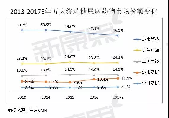 基層醫(yī)院得益于分級診療的全面推進(jìn),市場份額提高至14%。零售藥店份額占比為24%。隨著醫(yī)保控費(fèi)等政策的逐漸落地,以及醫(yī)藥分家、處方外流等政策的推進(jìn),醫(yī)院渠道份額將逐年下降。2017年零售藥店糖尿病市場份額將保持增長趨勢,預(yù)計(jì)增速將高于總體市場。