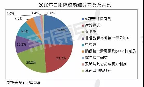 據(jù)中康CMH監(jiān)測數(shù)據(jù)顯示,口服降糖藥中化學(xué)藥占據(jù)主導(dǎo)地位,份額占比89.9%,而中成藥占比9.3%。從口服降糖藥細(xì)分的亞類看,2016年市場份額占比最大的亞類是α-糖苷酶抑制劑,達(dá)到25.6%,其次是磺酰脲類23.2%、雙胍類20.8%。