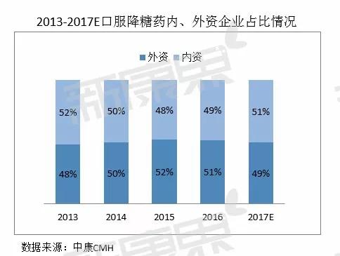 在零售藥店渠道口服降糖藥市場,內(nèi)、外資企業(yè)各占半壁江山。2016年外資企業(yè)略勝一籌,占據(jù)51%的份額,而內(nèi)資企業(yè)占據(jù)49%的份額。不過,內(nèi)資企業(yè)之所以有這樣的市場表現(xiàn),得益于廠家數(shù)量眾多,各廠家份額相對較小,而外資企業(yè)則相反。