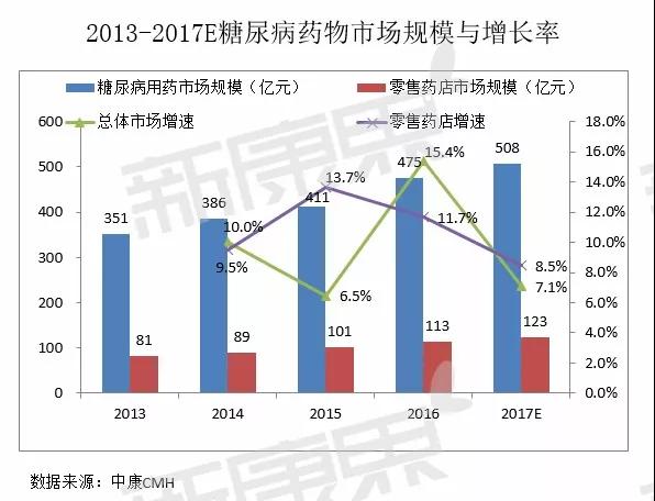 2型糖尿病是最常見的患病類型,占比約90%,與需要不間斷提供胰島素的1型糖尿病相比,2型患者主要通過口服降糖藥進(jìn)行血糖控制。2016年零售藥店口服降糖藥的市場規(guī)模為72.4億元,同比增長13%。