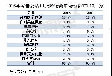據(jù)中康CMH監(jiān)測數(shù)據(jù)顯示,2016年零售藥店口服降糖藥暢銷品種TOP10份額占比為88.4%,市場集中度較高。TOP10品種全部為單方制劑,而相對更高效、便捷的復(fù)方制劑在零售藥店具有巨大的發(fā)展空間。