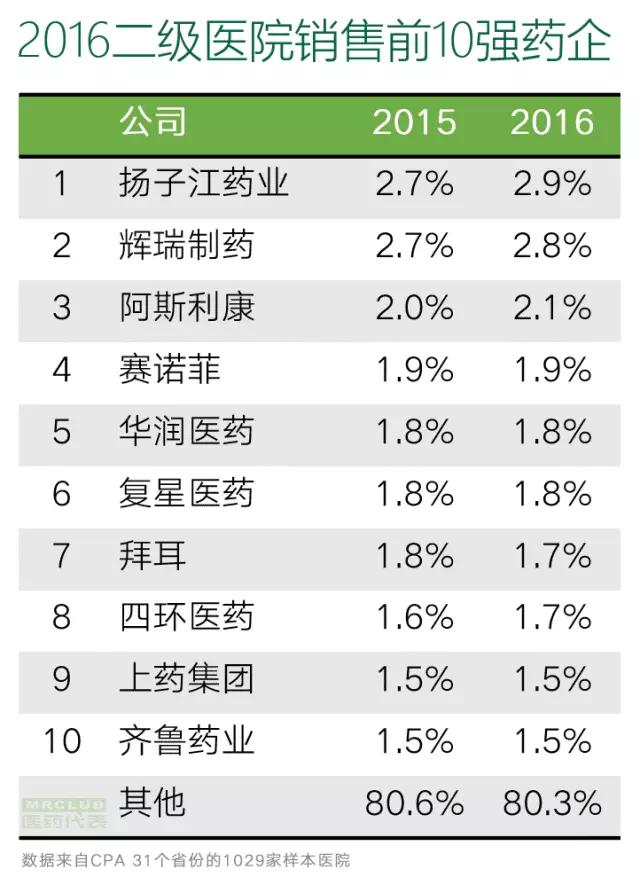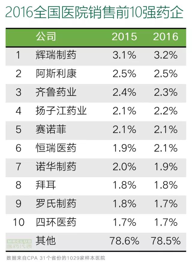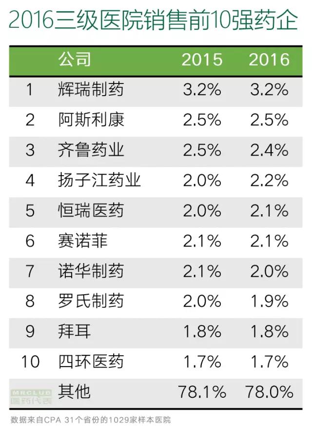 從CPA的樣本醫院數據來看,2016年較2015年前十強排名基本保持不變,跨國藥企在三級醫院和發達地區占據市場領先地位。