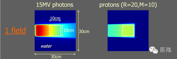 (圖自美國醫學物理學會資料,左為15MV X射線,右為質子束的劑量分布)