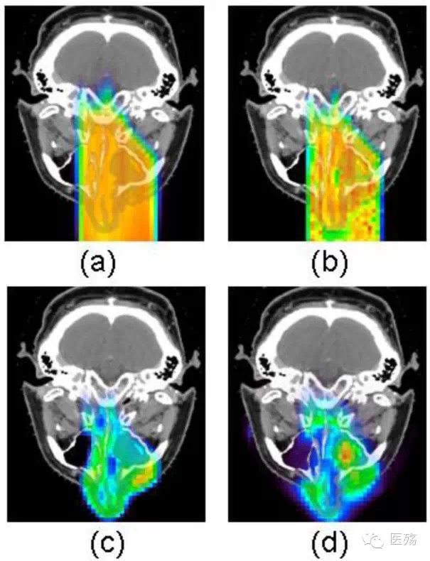 是用蒙特卡洛方法重新計算的治療計劃劑量分布;c 是用蒙特卡洛方法計算患者治療后的放射性強度分布;d