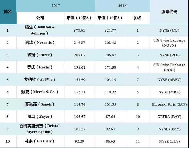 對比2016年TOP10榜單,有9家企業依然成功位列2017名單中,除了葛蘭素史克(GSK,市值為872.9億美元,比去年下降了16%),“后來居上”的是禮來(Eli Lilly,去年以866.3億美元的市值排名第11名)。
