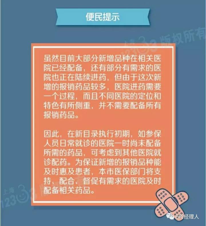 雖然目前大部分新增品種在相關醫院已經配備,還有部分有需求的醫院也正在陸續進藥,但由于這次新增的報銷藥品較多,醫院進藥需要一個過程,而且不同醫院的定位和特色有所側重,并不需要配備所有報銷藥品。因此,在新目錄執行初期,如參保人員日常就診的醫院一時尚未配備所需的藥品,可考慮到其他醫院就診配藥。為保證新增的報銷品種能及時惠及患者,本市醫保部門將支持、配合、督促有需求的醫院及時配備相關藥品。