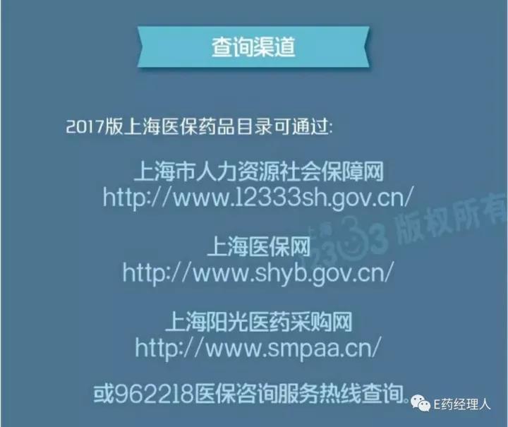 2017版上海醫保藥品目錄和新公布的腫瘤靶向藥及其個人定額自負標準可通過“上海市人力資源社會保障網(http://www.12333sh.gov.cn/)”、“上海醫保網(http://www.shyb.gov.cn/)”、“上海陽光醫藥采購網(http://www.smpaa.cn/)”,或962218醫保咨詢服務熱線查詢。