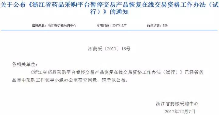 同時,對屬低價藥品目錄內的暫停產品,在符合國家和我省藥品采購和管理有關規定的前提下,開通綠色通道,可按暫停時的參照價及時恢復在線交易資格。此次受理截止日期為2017年12月31日。
