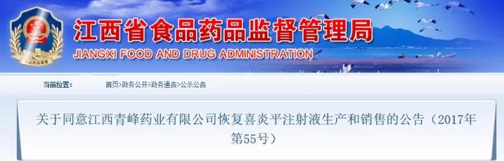 11月30日,江西省食藥監局發布《關于同意江西青峰藥業有限公司恢復喜炎平注射液生產和銷售的公告(2017年第55號)》。