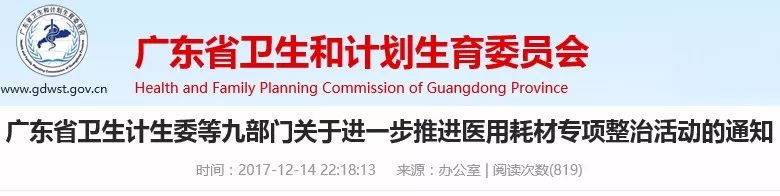 12月14日,廣東衛(wèi)計(jì)委、發(fā)改委等9部門(mén)聯(lián)合發(fā)布《關(guān)于進(jìn)一步推進(jìn)醫(yī)用耗材專(zhuān)項(xiàng)整治活動(dòng)的通知》(下稱(chēng)通知)。