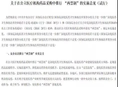 2016年7月19日,八部委聯合印發《2016年糾正醫藥購銷和醫療服務中不正之風專項治理工作要點》,明確要在11個綜合醫改試點省,和200個公立醫院綜合改革試點地區的藥品、耗材采購中實行“兩票制”。