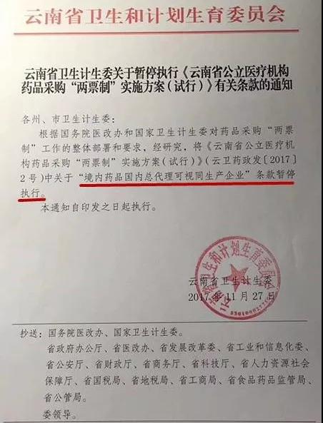 11月,云南對“兩票制”實施方案做出類似調整, 暫停對“境內藥品國內總代視為生產企業”。