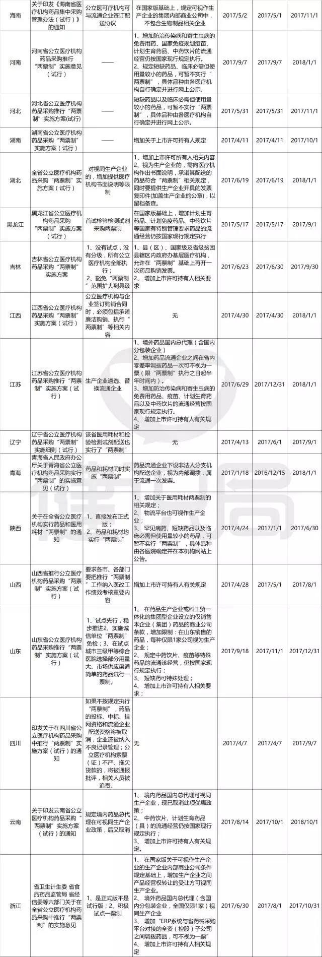 健識君梳理,自2016年10月安徽省執行“兩票制”以來,除港澳臺地區外,全國31省、直轄市、自治區均已發布“兩票制”實施方案或轉發國家版實施意見,明確執行“兩票制”時間表。國家醫改辦體改司統計,目前,全國已有至少2/3的城市在公立醫院藥品采購中,執行“兩票制”。