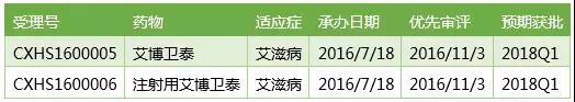 注射用艾博衛泰的上市申請在2016/7/18獲得CDE承辦受理,走特殊審批通道,2016/11/3被CDE以“抗艾滋病,創新藥”的理由納入優先審評,目前技術審評(藥學、藥理毒理、臨床)已完成,正在等待認證中心的現場檢查,三合一報告(技術審評報告、現場核查報告、抽檢報告)即將出具,預計會在2018Q1獲批上市。
