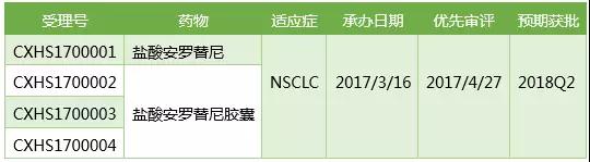 安羅替尼治療非小細胞肺癌的上市申請在2017/3/16獲得CDE承辦受理,走特殊審批通道,2017/4/27以“與現有治療手段相比具有明顯治療優勢;重大專項”的理由被CDE納入優先審評。目前藥理毒理、臨床部分的技術審評已完成,藥學部分排隊待審評,之后將會陸續進入現場核查,出具三合一報告,預計在2017Q2可以獲得CFDA批準。