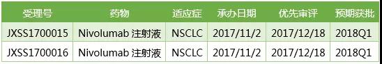 Nivolumab在中國二線治療NSCLC的上市申請于2017/11/2獲得CDE承辦受理,在2017/12/18被CDE以"與現有治療手段相比具有明顯治療優勢"的理由納入優先審評。Nivolumab雖然目前尚未進入審評排隊序列,但是鑒于其臨床療效確切、受關注程度極高,而且生物藥的審評任務相對較少,幾乎沒有積壓,因此非常看好Nivolumab神速獲批。