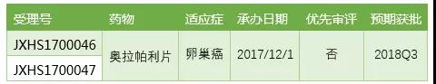 奧拉帕利二線治療卵巢癌的中國上市申請于2017/12/1獲得CDE承辦受理,是三報三批取消后第一個使用國際多中心臨床試驗數據申請中國上市的進口新藥,由于剛剛提交上市申請半個月,后續被CDE納入優先審評的可能性極高,預計會在2018Q3獲得CFDA批準上市。