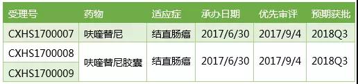 呋喹替尼治療晚期結直腸癌的上市申請2017/6/30獲得CDE承辦受理,2017/9/4以“具有明顯臨床價值;重大專項”的理由被CDE納入優先審評。目前藥理毒理部分的技術審評已完成,藥學和臨床排隊待審評,預計會在2017Q3獲得CFDA批準上市。呋喹替尼在中國上市后的商業化推廣主要由禮來負責。