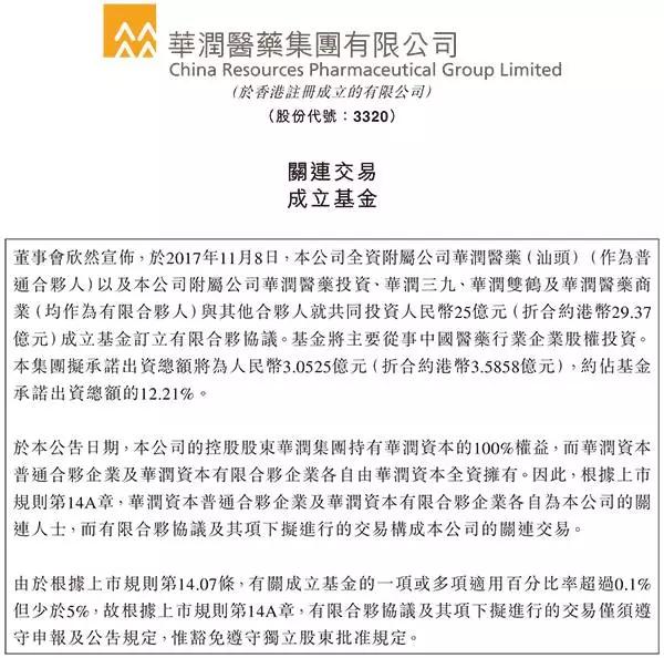 就在上海醫(yī)藥積極與康德樂洽談收購細節(jié)時,今年11月,華潤醫(yī)藥發(fā)布公告稱,與漢威華酉、漢威華德、華潤三九和華潤雙鶴,共同投資人民幣25億元成立基金,計劃用于未來的渠道投資,重點擴張藥品流通領(lǐng)域業(yè)務(wù)。