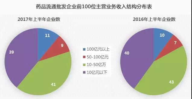 商務(wù)部流通秩序司最近發(fā)布的《2017年上半年藥品流通行業(yè)運行分析暨發(fā)展趨勢預(yù)測》顯示,2017年上半年,全國七大類醫(yī)藥商品銷售總額9894億元(含稅),其中藥品批發(fā)企業(yè)主營收入前100位,占同期全國醫(yī)藥市場總體規(guī)模的70.1%(5931億元),同比上升3.4個百分點。