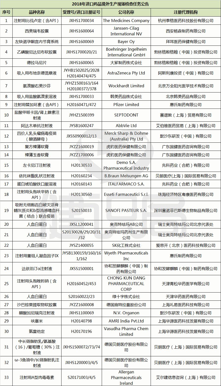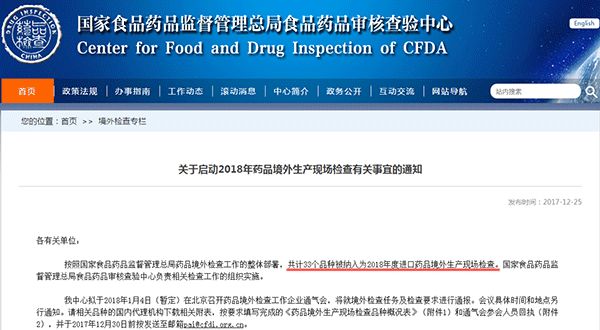 根據國家食藥監管總局食藥審核查驗中心最新發布的《2018年進口藥品境外生產現場檢查任務公告》,明年CFDA境外“飛檢”任務涉及33個產品,多為知名外企的明星產品