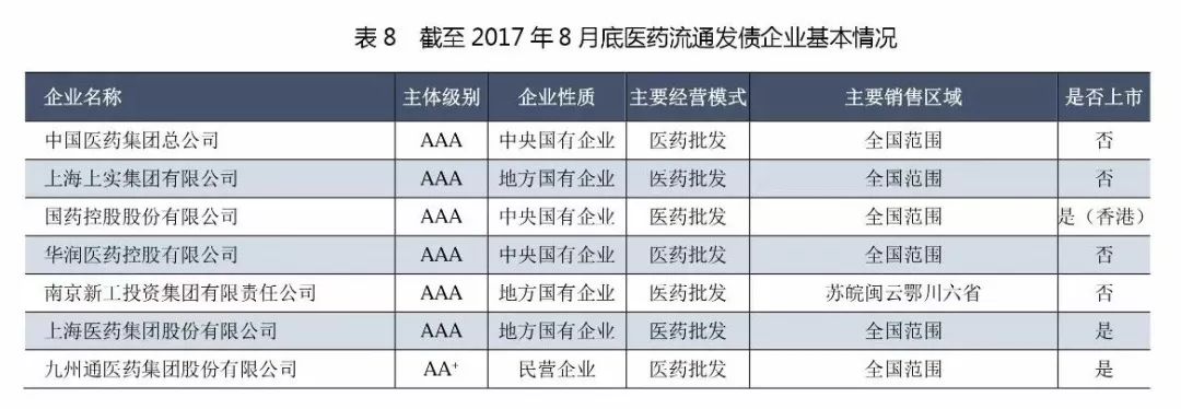 截至2017年8月底,在中國境內債券市場公開發行債券的醫藥流通企業主要為4家全國性龍頭企業及其子公司,以及部分區域性龍頭企業。所發行債券處于存續期內的發行主體合計14家,其中醫藥批發企業12家。