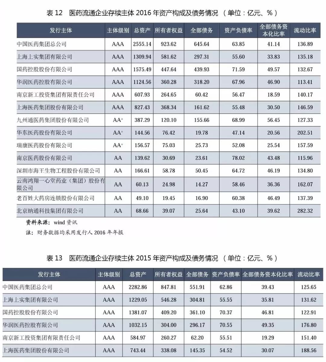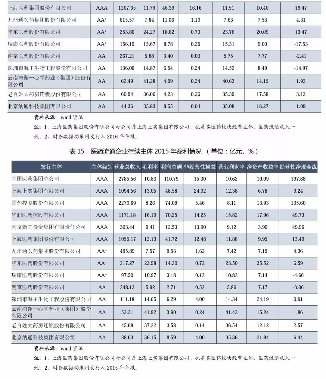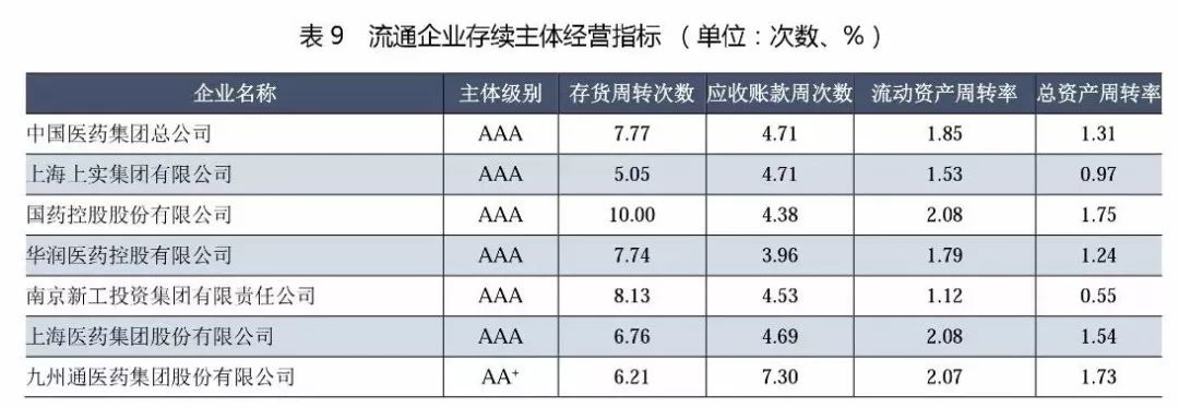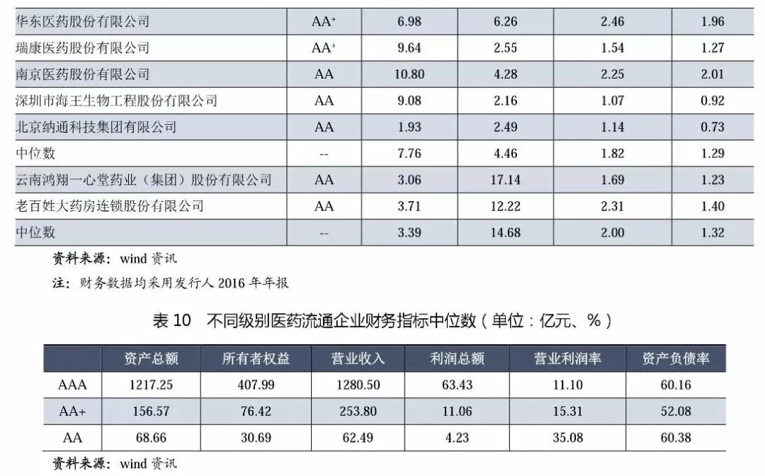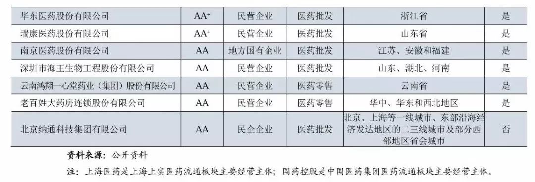 (1)從級別分布來看,主體長期信用等級為AAA的企業有6家,其中中國醫藥集團、華潤醫藥控股和上海醫藥(上海上實的醫藥流通經營主體)為3家全國性的醫藥流通企業,上述企業均為中央企業和國有企業,擁有廣闊的分銷渠道和上下游資源,銷售終端為醫院,經過多年的兼并、收購成長為全國性醫藥流通巨頭。南京新工是地方國企,已發展成為區域性流通龍頭;國藥控股是中國醫藥集團總公司旗下醫藥流通板塊主要運營主體,目前已建立了中國最大的、直達終端的藥品分銷、零售連鎖和物流配送網絡。