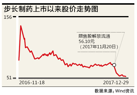 2017年11月20日是步長制藥上市滿一年的日子,在這一天,占公司總股本37.85%的2.58億股限售股解禁流通,公司股價迅速下挫,從10月份的75元左右跌至12月28日的50元附近。一連串的暴跌一度引發了質押股票平倉風險,致使控股股東不得不在12月5日補充質押500萬股。