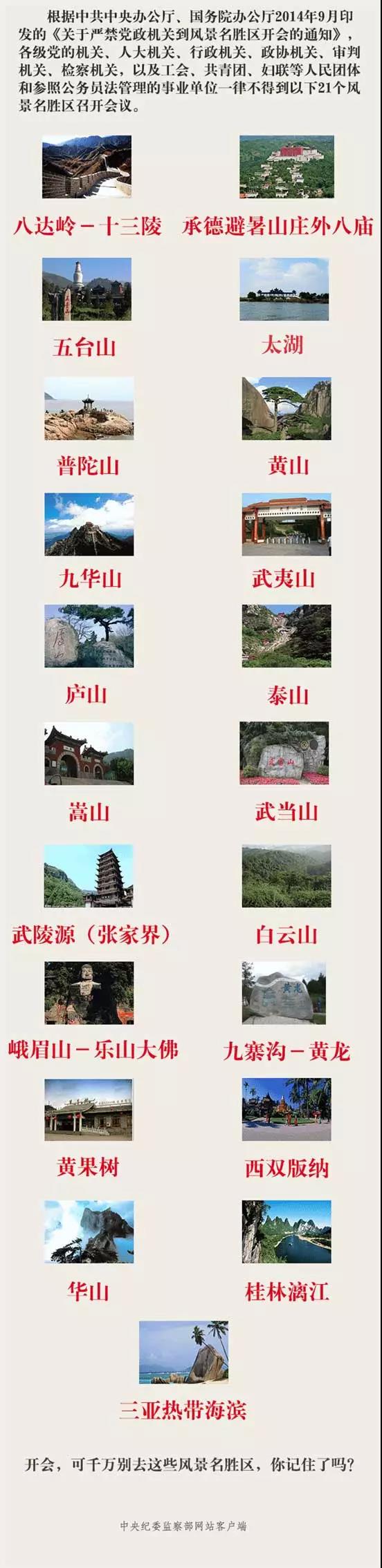 早在2015 年,中紀委就下發(fā)通知,提醒各級黨的機關(guān)、人大機關(guān)、行政機關(guān)、政協(xié)機關(guān)、審判機關(guān)、檢察機關(guān),以及工會、共青團、婦聯(lián)等人民團體和參照公務(wù)員法管理的事業(yè)單位一律不得到21個風景名勝區(qū)召開會議。