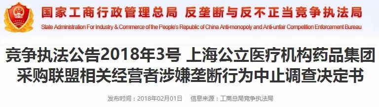 2月1日,國家工商總局競爭執法局發布《上海公立醫療機構藥品集團采購聯盟相關經營者涉嫌壟斷行為中止調查決定書(競爭執法公告2018年3號)》(下稱決定書)。