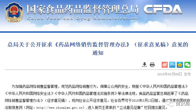 但網售藥品監管新政并非全無回旋余地。CFDA《通知》介紹:社會各界可于2018年3月12日前,通過登錄中國政府法制信息網,進入首頁主菜單的“立法意見征集”欄目提出意見。