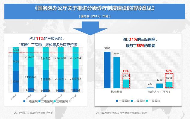 數據統計,中國衛生總費用逐年增加,2016年達 46344.9億元,較2011年增加了近一倍。但相較于發達國家,我國的千人口床位數、醫生數、護士數仍有較大差距。占比11%的三級醫院服務了53%的患者。