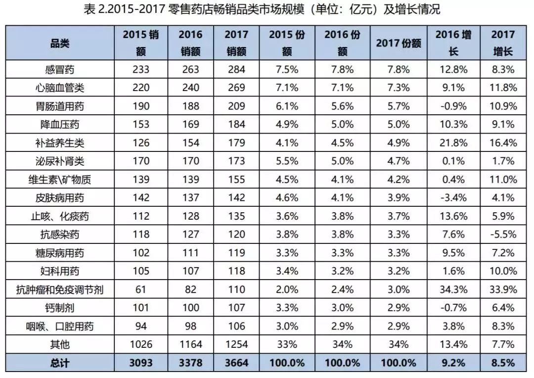 2017年全國零售終端市場規模超過100億元的品類較2016年增長2個,增長至共15個,合計銷售額2410億元,占整個市場的65.8%。感冒藥、心腦血管藥和胃腸道用藥仍為規模前三的品類,合計銷售額762億元,占整個市場的20.8%。