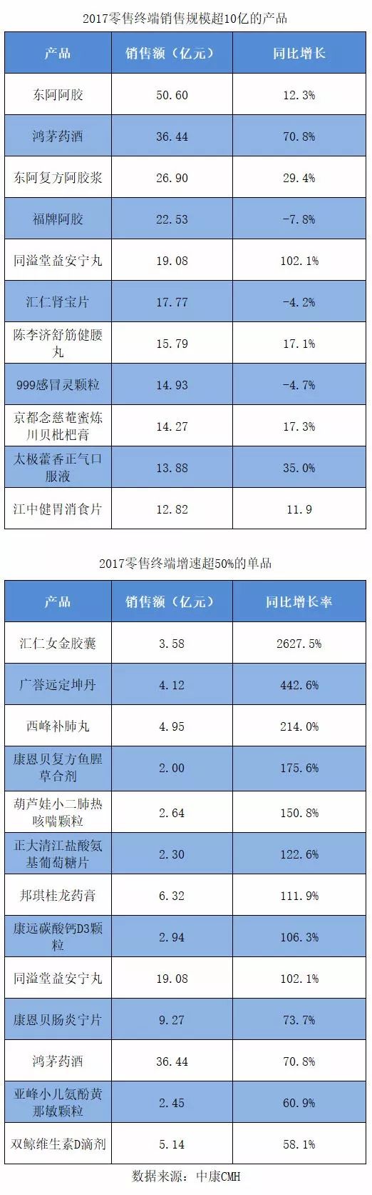 東阿阿膠以超50億的銷售額位列第一,江中健胃消食片以12.82億元收尾前十名。