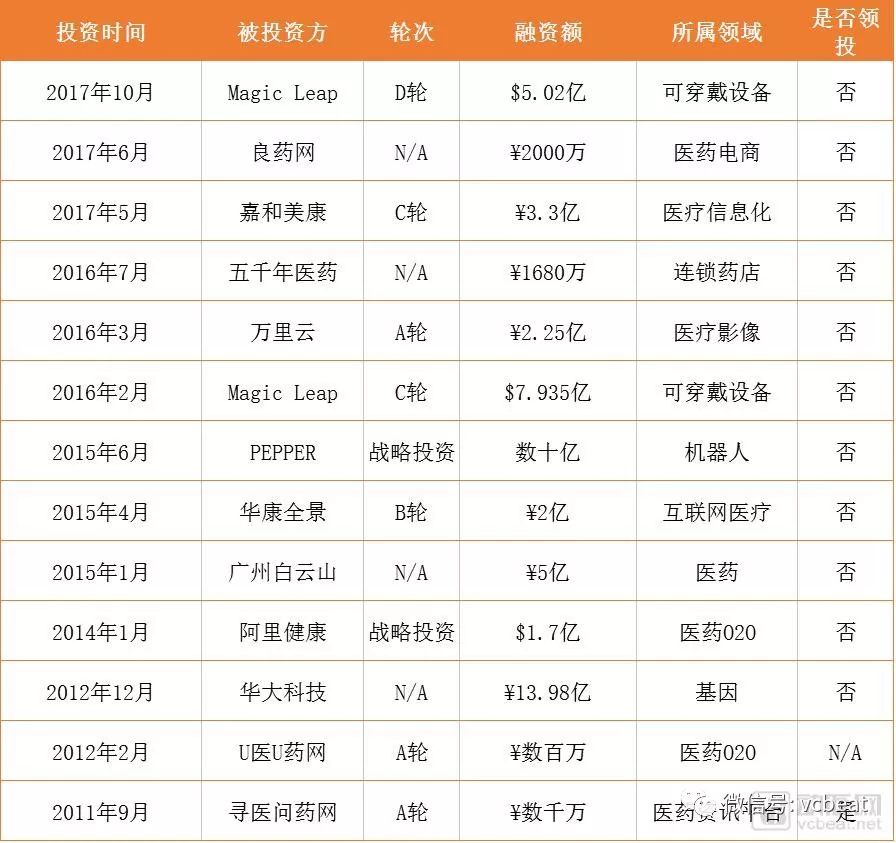除了表格中投資并購的企業外,阿里巴巴還在智能移動醫療設備領域與魚躍科技合作,在醫療影像領域入股華潤萬東,在體檢檢測領域與迪安診斷戰略合作。