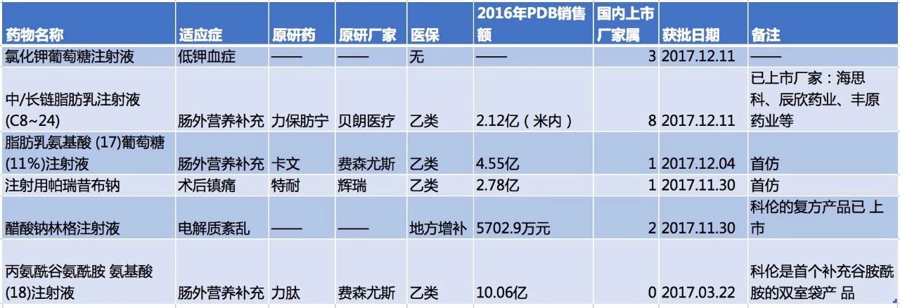 而在過去的2017年,科倫藥業也共計有7個仿制藥產品獲批上市。值得注意的是,其中有三個產品為首仿,分別為脂肪乳氨基酸(17)葡萄糖(11%)注射液、注射用帕瑞昔布鈉以及丙氨酰谷氨酰胺氨基酸(18)注射液,2016年其原研產品樣本醫院銷售數據分別為4.55億、2.78億、10.06億。