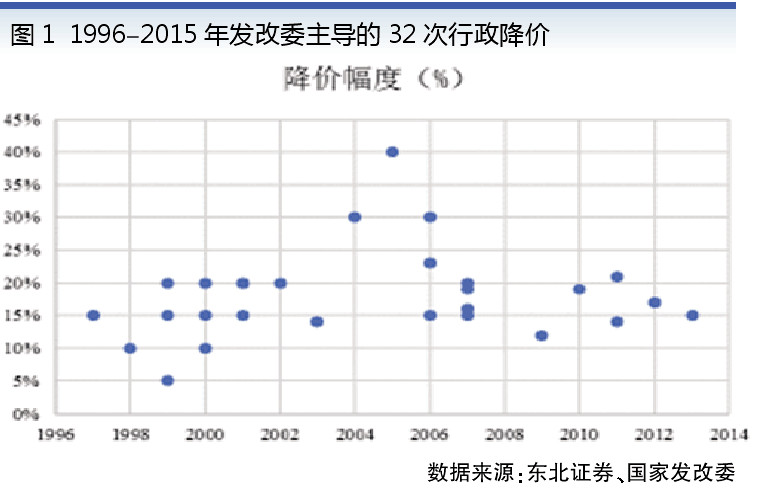 從1996年國(guó)家計(jì)委出臺(tái)《藥品價(jià)格管理暫行辦法》,到2015年發(fā)改委等七部委發(fā)布《關(guān)于印發(fā)推進(jìn)藥品價(jià)格改革意見的通知》要求自2015年6月1日起放開政府定價(jià),這20年間共進(jìn)行了32次藥品行政性降價(jià)(見圖1),累計(jì)降價(jià)近千億元。