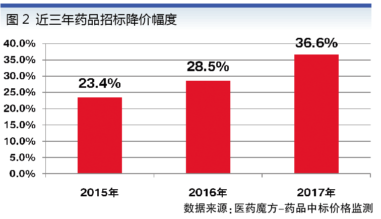 招標(biāo)導(dǎo)致藥品降價(jià)幅度逐年加劇,僅以2015-2017年為例,招標(biāo)降價(jià)的幅度就依次增加到23.4%、28.5%和36.6%(見圖2)。