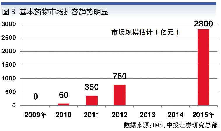 國(guó)家發(fā)改委、衛(wèi)生部等九部委于2009年8月18日發(fā)布的《關(guān)于建立國(guó)家基本藥物制度的實(shí)施意見》,標(biāo)志著我國(guó)建立國(guó)家基本藥物制度工作的正式實(shí)施。兩次黨代會(huì)和中辦國(guó)辦文件也強(qiáng)調(diào)了基本藥物制度的重要性(見表1),并且規(guī)定,基本藥物全部納入基本藥品保障報(bào)銷目錄,報(bào)銷比例明顯高于非基本藥物,還對(duì)各級(jí)醫(yī)療機(jī)構(gòu)規(guī)定了最低使用比例。其間,政府還投入了8500億元以健全基本醫(yī)療衛(wèi)生服務(wù)體系,建立基本藥物制度等,基藥銷量也逐年大幅提升(見圖3)。