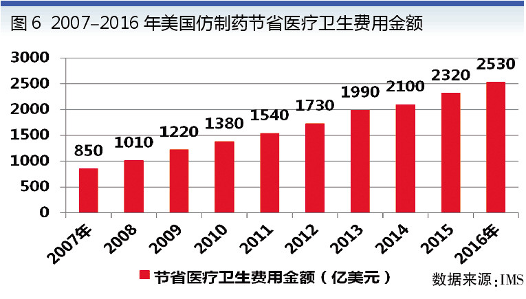 按病種付費(fèi)被多國(guó)證明是有效的控制藥費(fèi)的好方法,而DRGs(Diagnosis Related Groups,即疾病診斷相關(guān)分類)作為按病種付費(fèi)的分支,是當(dāng)今世界公認(rèn)的比較先進(jìn)的支付方式之一。美國(guó)實(shí)施DRGs后,人均醫(yī)療費(fèi)用支出增速得到了明顯控制。其核心在于使醫(yī)院有動(dòng)力在確保療效與原研藥相同的前提下,大量使用價(jià)格更低的仿制藥來(lái)替代原研藥。十年時(shí)間,美國(guó)仿制藥替代原研為國(guó)家節(jié)省了1.67萬(wàn)億美元的醫(yī)療支出(見圖6)。