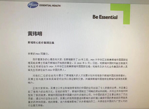 今天(4月23日),輝瑞公司官方宣布,在輝瑞服務了15年之后,輝瑞核心醫療大中華區總裁兼輝瑞中國國家經理吳曉濱博士將離開輝瑞去開始新的事業。