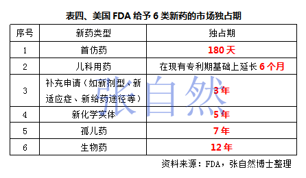 為激勵原研和首仿,FDA還給予獲批藥品一定時間的市場獨占期(表四),在市場獨占期內,FDA不會批準仿制藥企業上市相應的仿制產品。