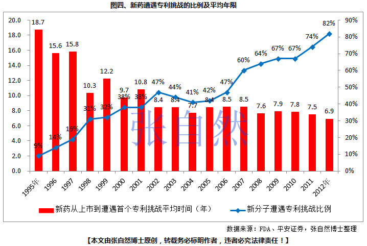 隨著醫藥研發的競爭加劇,新分子遭遇專利挑戰的比例已由1995年的9%上升到2012年的82%,新藥從上市到首次遭遇專利挑戰的平均時間也由1995年的18.7年縮短到2012年的6.9年。