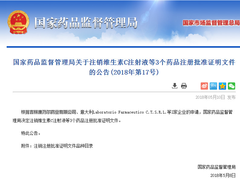 昨日(5月10日),國家藥監局發布《國家藥品監督管理局關于注銷維生素C注射液等3個藥品注冊批準證明文件的公告(2018年第17號)》。