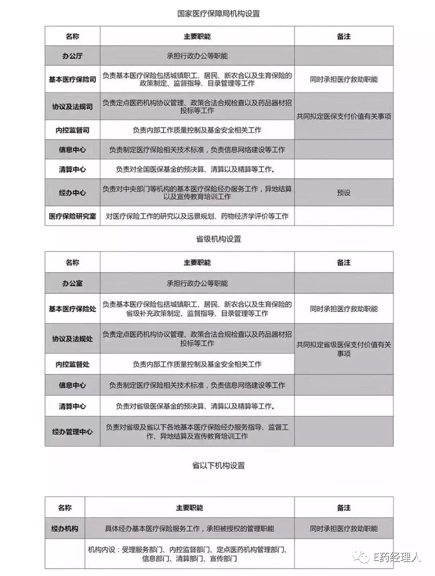 根據E藥經理獲得訊息顯示:醫療保障局下設8個組成部門,包括辦公廳、基本醫療保險司、協議及法規司、內控監管司、信息中心、清算中心、經辦中心以及醫療保險研究室。