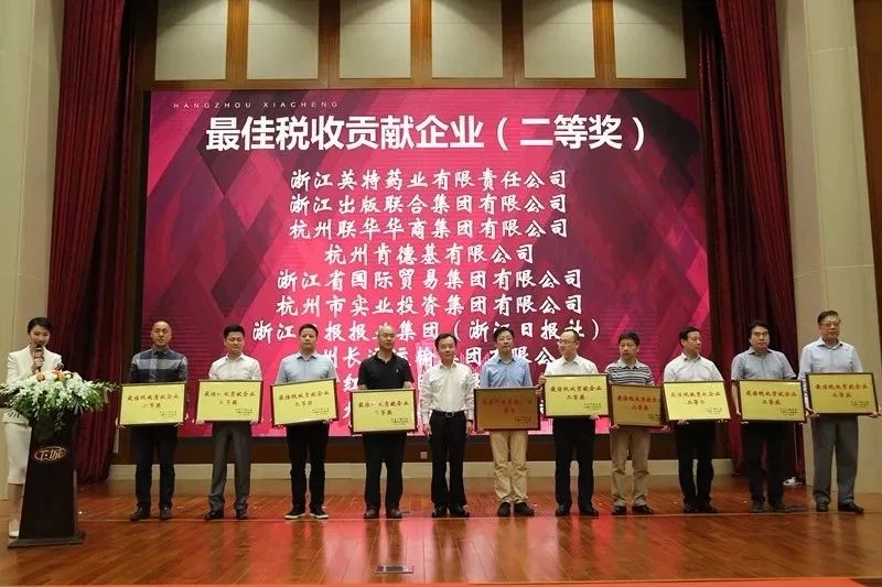 區長柴世民為榮獲2018年度下城區“最佳稅收貢獻企業二等獎”的企業代表頒獎。浙江省國際貿易集團有限公司、浙江英特藥業有限責任公司榮獲最佳稅收貢獻企業二等獎。
