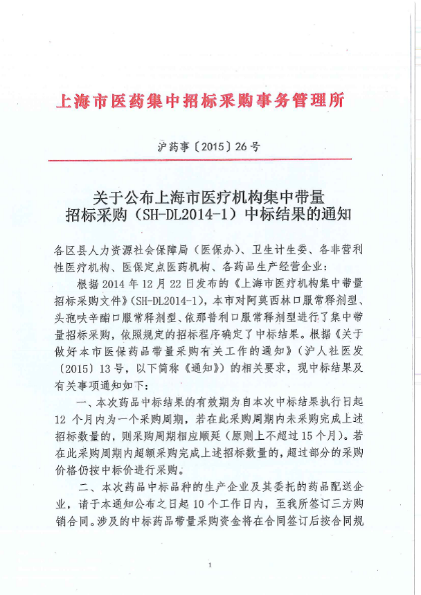 附件一:《關于公布上海市醫療機構集中帶量招標采購(SH-DL2014-1)中標結果的通知》(滬藥事〔2015〕26 號)