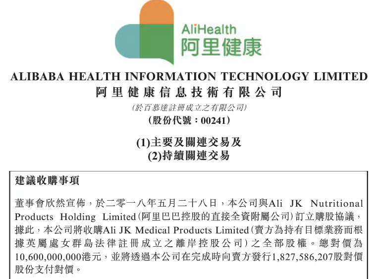 5月29日,阿里健康發布公告,通過發行股份方式收購阿里巴巴子公司Ali JK Medical Products Limited,總代價相當于106億港元。