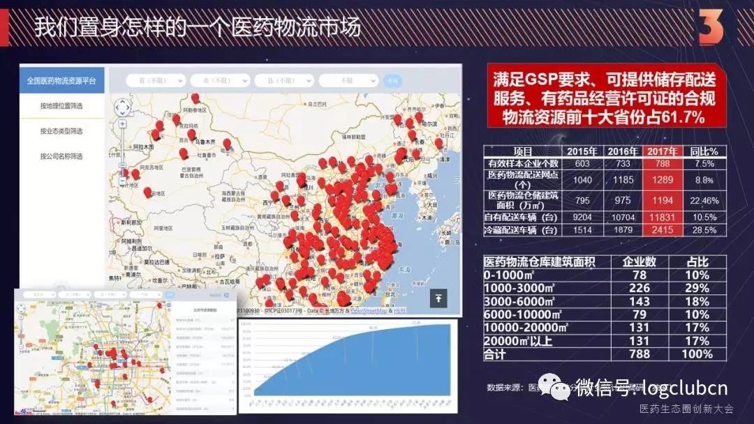 這是中國醫(yī)藥商業(yè)協(xié)會醫(yī)藥供應鏈分會的獨家數(shù)據(jù),可以看出,滿足GSP要求,可以提供存儲配送,尤其是存儲業(yè)務的合規(guī)的、有藥品經(jīng)營許可證的前十大省份占資源的61.7%,有效企業(yè)樣本物流倉庫面積已經(jīng)達到了將近12000平米。6000m2以下倉庫面積占了將近60%的樣本量,1000m2以下、1000—3000m2、3000—6000m2這個體量還是比較大,這也可以看出行業(yè)在現(xiàn)代物流道路上還有一定的潛力。